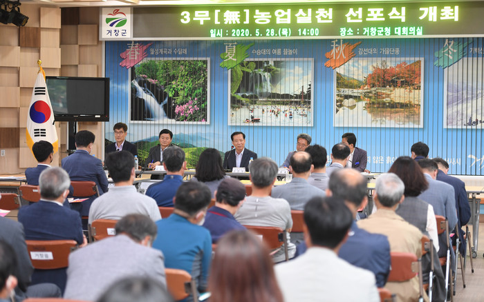 거창군은 28일 군청 대회의실에서 3無농업 실천 참여농가, 군의회 의장과 의원, 농협군지부장, 농업관련단체장 등 100여명이 참석한 가운데 3無농업 실천 선포식을 가졌다.