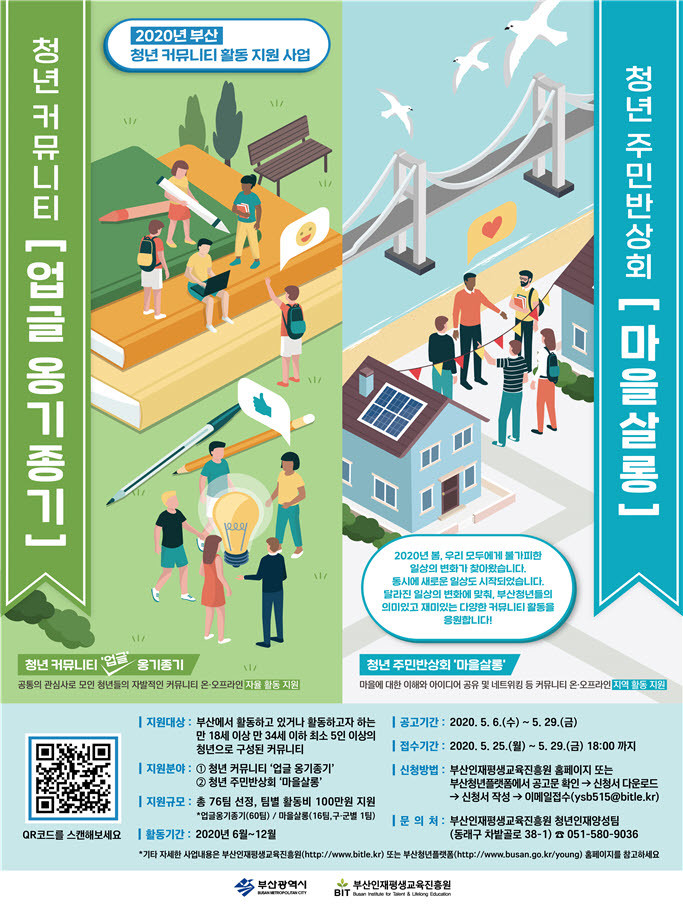 [부산=김재현 기자] 부산광역시(시장직무대행 변성완)는 청년들의 자발적인 활동여건을 강화하고 사회참여를 활성화하기 위한 「2020년 청년 커뮤니티 활동 지원 사업」의 참여 커뮤니티를 모집한다.