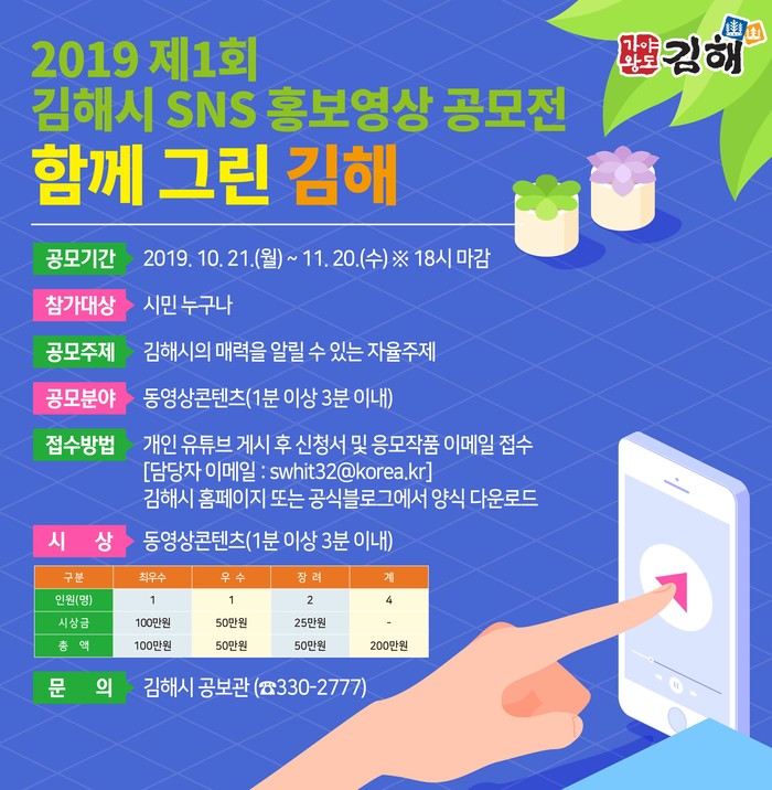 시 관계자는 “김해의 잘 알려지지 않은 모습이나 숨은 매력을 표현한 우수 영상콘텐츠를 발굴해 우리지역을 보다 더 널리 알리고 우리시 SNS에 대한 시민 관심도를 높이기 위해 이번 공모전을 기획했다”라고 밝혔다.