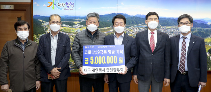 대구개인택시 합천향우회(회장 이재종)는 25일 합천군청을 방문해 코로나19로 어려움을 겪고 있는 군민을 위해 써 달라며 500만원을 군에 기탁했다.