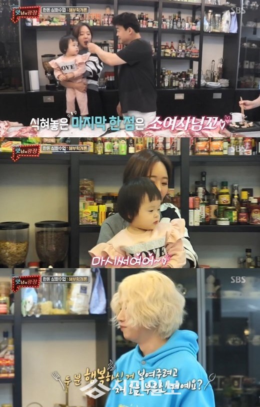 소유진의 말에 백종원은 항정살을 구워준다고 답했고, 백종원은 다 구운 고기를 아이들과 소유진에게 차례로 먹여줬다.