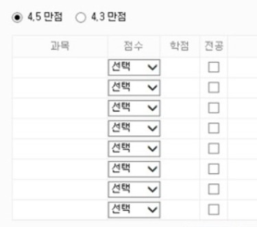 특히, 성적계산기는 간단한 입력만으로 전체 학점을 계산할 수 있는 프로그램을 제공한 것으로, 자신의 대학 학점 타입에 맞춰 ‘4.3만점’과 ‘4.5만점’ 타입을 선택한 후에 과목별 점수 학점(시수)를 입력하면 평균값인 학점을 계산해준다.