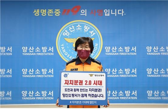 양산소방서(서장 박정미)는 임정섭 양산시의회의장의 지명을 받아 지방분권 2.0시대 개막을 응원하는 “자치분권 기대해” 챌린지에 동참했다고 지난 28일 밝혔다.