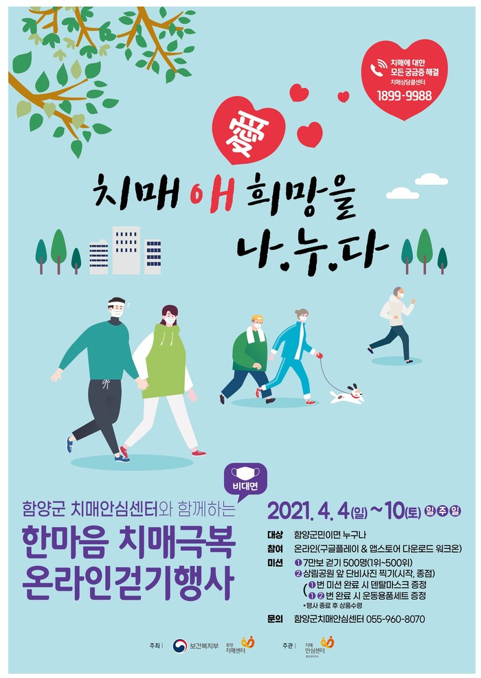 보건복지부 및 중앙치매센터에서 주최하며 함양군치매안심센터에서 주관하여 운영하는 이번 걷기대회는 코로나19로 인해 온라인(비대면)으로 진행된다.