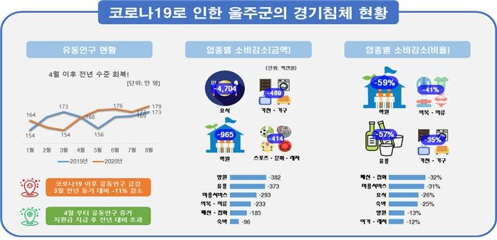 코로나19로 인한 경기침체 현황을 분석한 결과, 유동인구는 3월까지 급격히 감소했지만, 4월부터 지난해 수준 이상으로 증가했다. 업종별 소비감소 추세를 보면 금액 기준으로 가장 감소한 업종은 요식(-4,704백만원), 학원(-965백만원), 가전ㆍ가구(-469백만원), 스포츠ㆍ문화ㆍ레저-414백만원) 순이며, 비율 기준으로는 학원(-59%), 유흥(-57%), 의복·의류(-41%), 가전·가구(-35%), 패션·잡화(-32%) 순으로 많이 줄었다.