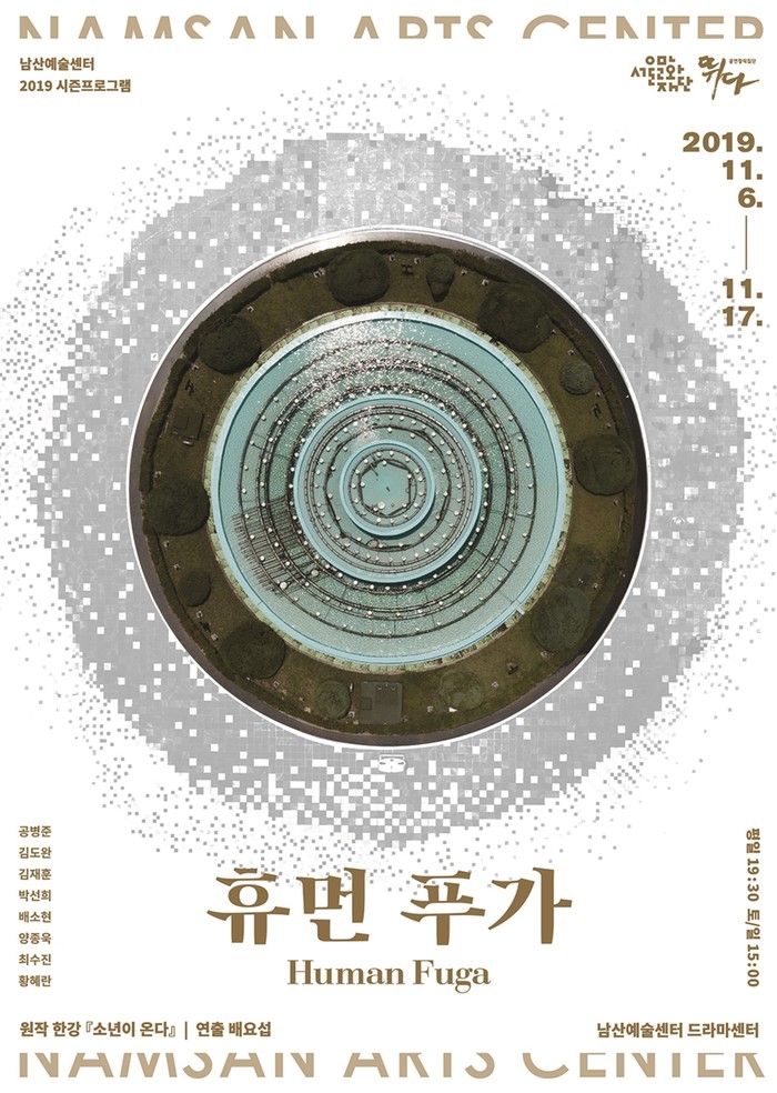 <휴먼 푸가>는 남산예술센터 공동제작 공모를 통해 선정됐다. 원작 『소년이 온다』는 1980년 5월, 계엄군에 맞서 싸운 이들과 남겨진 이들의 고통을 그린다. 하나의 사건이 낳은 고통이 여러 사람들의 삶을 통해 변주되고 반복되고 있는 소설의 구조는, 독립된 멜로디들이 반복되고 교차되고 증폭되는 푸가(fuga)의 형식과도 맞닿아 있다. 소설을 연극으로 만들기까지 오랜 고민을 한 연출가 배요섭은 “이미 소설로 충분한 작품을 연극으로 올리는 것은 사회적 고통을 기억하고, 각인하는 방식에 대한 고민의 과정”이라고 밝혔다.
