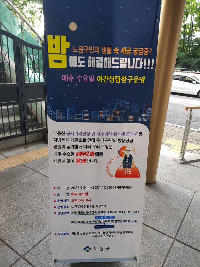야간 상담은 구청 세무과 직원 3명과 재능기부 세무사 1명 등 총 4명이 담당하며, 노원구청 2층 세무2과 민원실에서 이뤄진다.