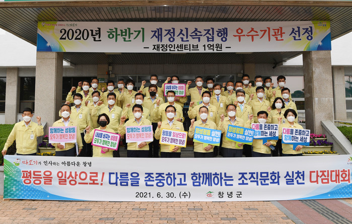한편 군은 교육을 마친 후 군청 현관에서 참석자 모두가 참석한 가운데 성평등 조직문화 실천을 위한 ‘평등을 일상으로, 모두가 행복한 창녕”결의 다짐대회도 가졌다.