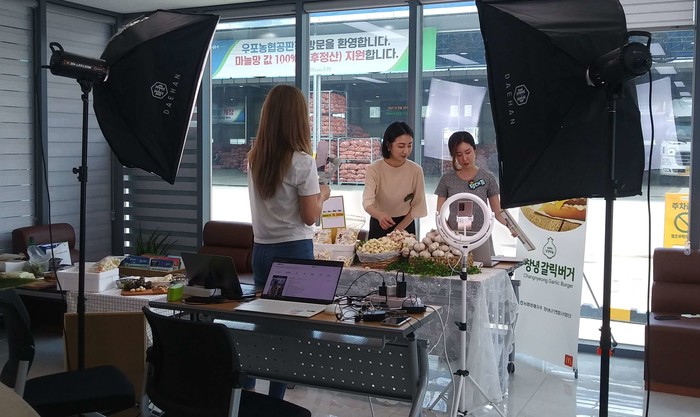 | ▲ 산지유통센터에서 깐마늘 라이브커머스를 진행하고 있다. |