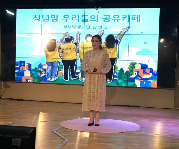 | 남민영 단장이 '창녕맘! 우리들의 공유카페'를 주제로 발표를 하고 있다. |