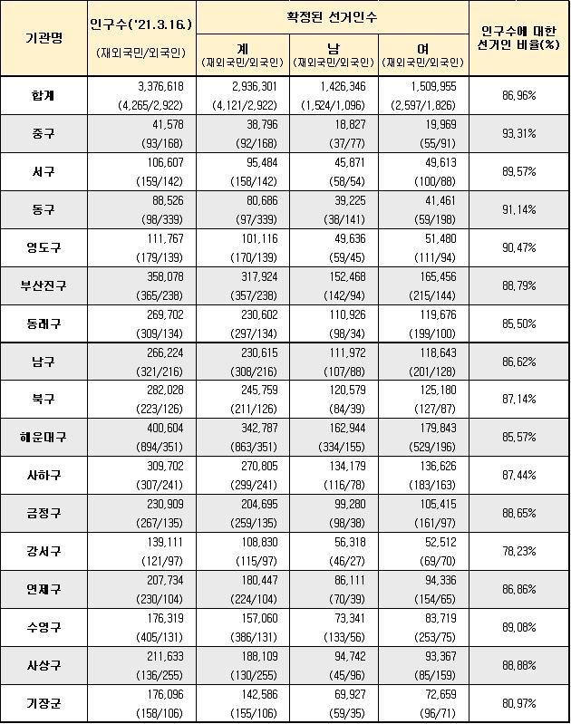 정임수 부산시 자치분권과장은 “유권자들이 구·군 홈페이지와 투표안내문 등을 통해 선거인명부 등재번호, 투표소의 위치 등을 사전에 파악한 후 투표에 참여해 줄 것”을 당부하면서 “부산시는 부산시선거관리위원회와 협력하여 투표소 방역은 물론 손소독제, 위생장갑 구비 등 시민들이 안심하고 투표할 수 있도록 철저한 투표소 안전대책을 마련할 계획”이라고 밝혔다.