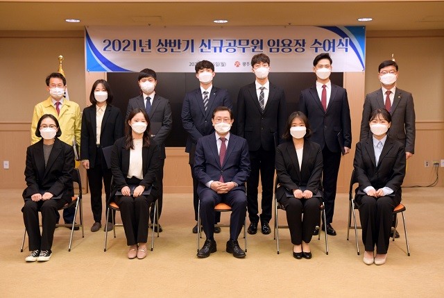 | ▲ 이용섭 광주광역시장이 15일 오전 시청 비즈니스룸에서 2021년 상반기 신규공무원 임용장 수여식에 참석해 기념촬영을 하고 있다./광주광역시 제공 |
