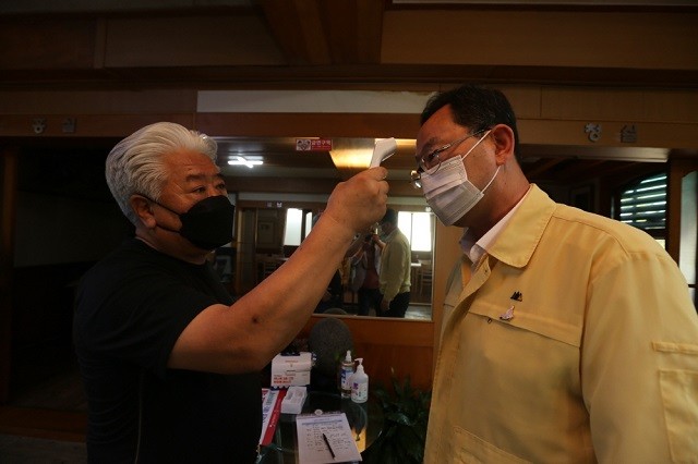 | ▲ 명현관 해남군수가 코로나19 확진자가 전국 및 인근 지역까지 발생됨에 따라 19일 직접 관내 다중이용시설 등을 방문해 코로나19 예방수칙 준수를 당부한 가운데 한 음식점에서 업주로부터 발열 검사를 받고 있다. / 해남군 제공 |