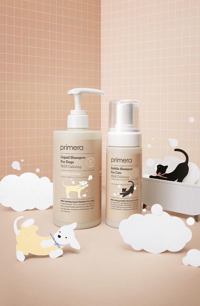 반려동물을 위한 프리메라 ‘마일드 카밍 리퀴드 샴푸 포 독’과 ‘마일드 카밍 버블 샴푸 포 캣’은 동물성원료, 실리콘오일, 광물성오일, 설페이트계면활성제 등 10가지 성분을 빼고(10-Free 처방), 안점막 자극 대체 테스트를 완료했다.