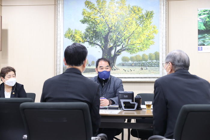 | ▲ 간담회에 참석한 박진식 의장(가운데)이 임원진들과 이야기를 나누고 있다.(사진제공=도봉구의회) |