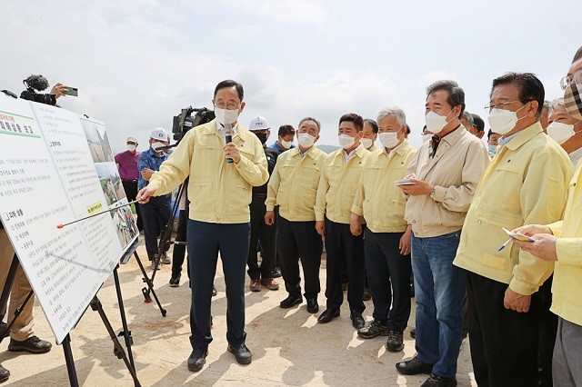 | ▲ 이낙연 더불어민주당 전 대표(우측 3번)가 지난 5~6일 내린 폭우로 침수피해가 심한 해남군 화산면 관동지구를 9일 오전 방문해 명현관 해남군수로부터 침수 피해 상황 설명을 듣고 있다. / 사진=해남군 제공 |