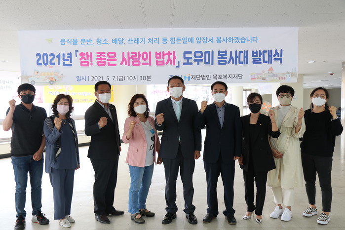 | 목포복지재단(이사장 이혁영) 이 최근‘사랑의 밥차’ 자체 도우미 봉사대를 구성해 발대식을 갖고 본격적인 활동에 들어갔다.(자료사진=목포복지재단) |