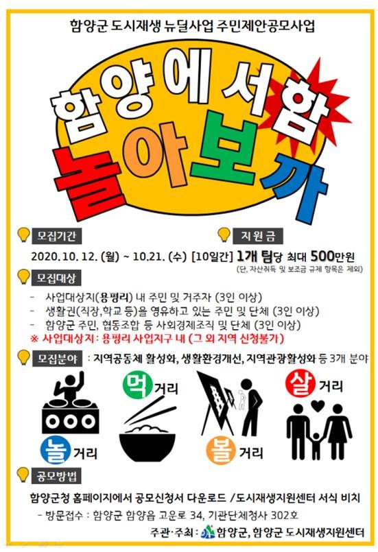 함양군은 주민공동체를 강화하고 지역주민이 주도하는 도시재생뉴딜사업 추진을 위해 2020년 용평리 주민제안 공모사업을 12일부터 시행한다고 밝혔다.