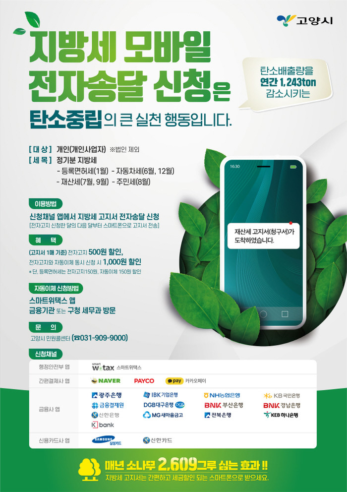 [고양=이기홍 기자] 고양시는 ‘지방세 모바일 전자송달 서비스’ 제도를 시민들에게 적극 홍보할 계획이다. 코로나19로 인해 비대면 서비스를 확대하고 기후위기 극복을 위한 탄소중립선언에 발맞추기 위해서다.