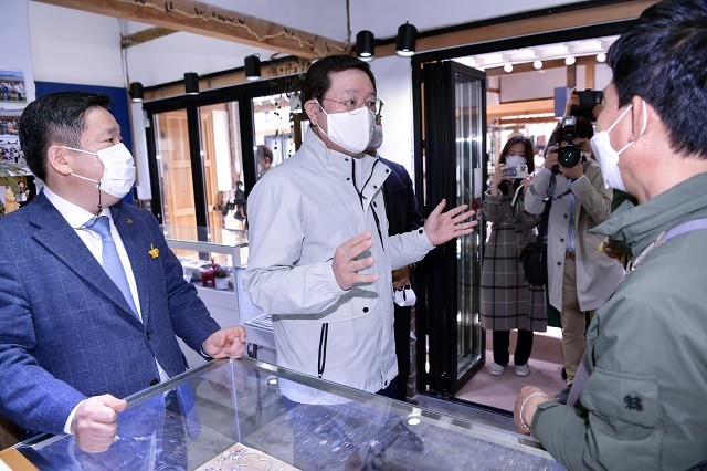 이 시장은 이날 섬유, 도자기, 금속, 목공예 등을 제작·판매하는 공방을 차례로 방문하고 정부 방역지침에 따른 프로그램 운영 취소 등으로 힘들게 공방을 꾸려가고 있는 공예인들의 상황을 듣고 건의사항을 논의했다.