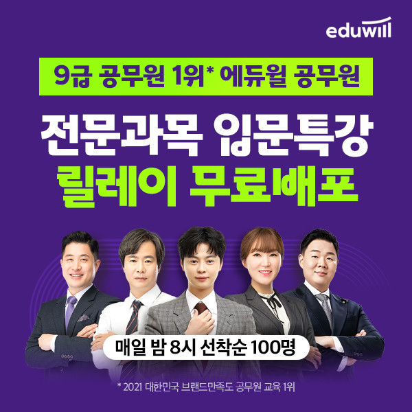 [시민일보 = 여영준 기자] 종합교육기업 에듀윌(대표 박명규) 공무원이 오는 28일까지 9급공무원 전문과목 입문특강 릴레이 무료배포 이벤트를 진행한다고 17일 밝혔다.