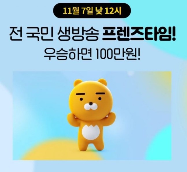 이날 7일 오전 카카오페이지 앱을 통해 출제된 '프렌즈타임 12시' 문제는 "우승하면 100만원! 프렌즈타임의 2~4라운드는 라이언 옆 □□□에서 힌트가 제공됩니다"에서 빈 칸을 채우는 문제다.
