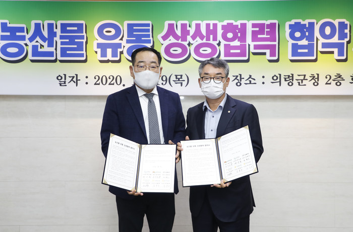 의령군-동화청과(주)-토요애유통(주)-농협중앙회 의령군지부-의령농협-동부 농협이 상호 협력하여 어려움을 겪고 있는 의령군 농산물 유통 상생 협력을 위한 업무협약(MOU)을 체결하였다.