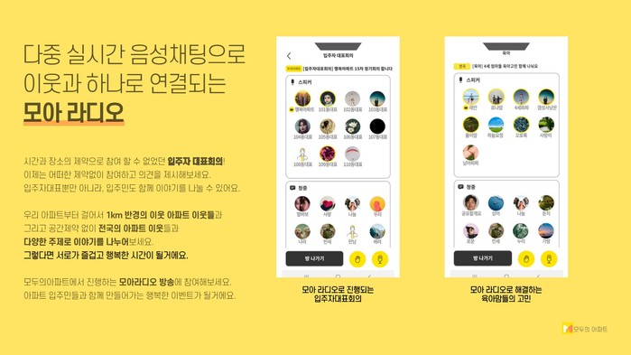 아파트 입주민이라면 누구나 이용할 수 있는 ‘모두의 아파트’ 앱은 주요 기능은 아파트 이웃간 재능공유, 음성채팅, 아파트생활 공동구매 서비스를 제공한다.