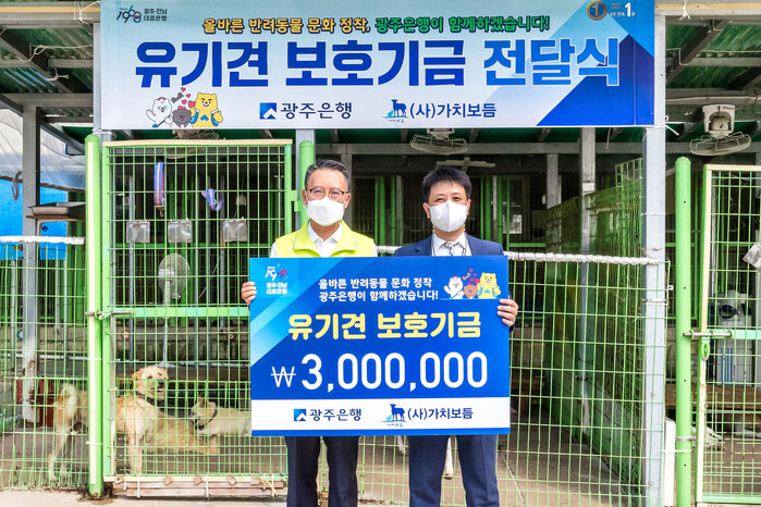 아울러 올바른 반려동물 문화 정착을 위해 유기견 보호센터에 ‘멍이냥이 신용·체크카드’ 이용금액의 0.1%를 특별기금으로 전달했다. 이에 송종욱 광주은행장은 광주 동물 보호소를 위탁 운영하고 있는 사단법인 가치보듬을 찾아 유기견 보호기금 300만원을 전달하며 상품 판매에 따른 수익 일정부분을 지역사회에 환원함으로써 진정한 이익 이상의 가치를 추구하고 있다.