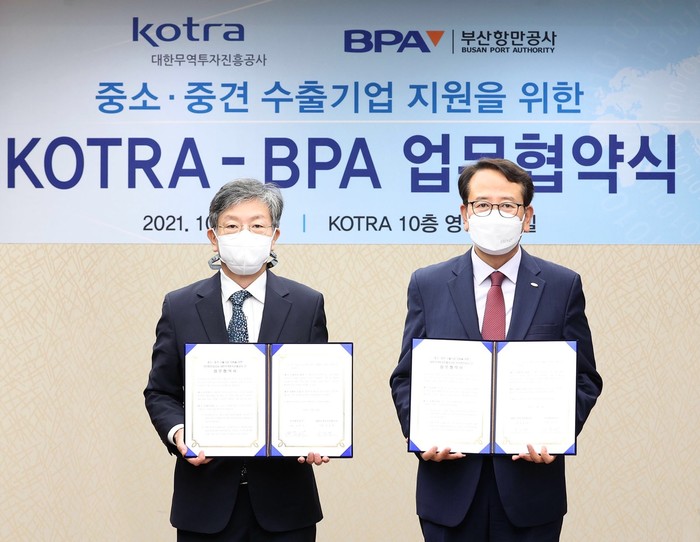 부산항만공사(BPA, 사장 강준석)는 대한무역투자진흥공사(KOTRA, 사장 유정열)와 내년 초 개장 예정인 BPA 해외 물류센터(네덜란드 로테르담 및 인도네시아 동부 자바, 스페인 바르셀로나 등)를 KOTRA의 해외 공동물류센터로 지정하기 위한 업무협약을 14일 체결했다고 밝혔다.