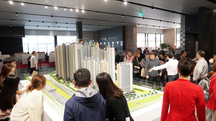 쌀쌀한 날씨에도 불구하고, 견본주택 오픈 시간인 오전 10시 전부터 긴 대기줄이 이어졌다. 내부 상담석도 빈 자리를 찾기 어려웠으며, 고객들은 전문 상담사에게 청약자격 등을 따져보느라 분주했다. 유니트(실내 모형도)를 둘러보며 특화평면과 마감 여부도 꼼꼼하게 체크했다.