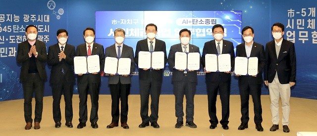 광주시는 17일 오전 시청 비즈니스룸에서 이용섭 시장과 5개 자치구 구청장, 광주테크노파크 인공지능종합지원센터장이 참석한 가운데 일상생활 속 인공지능(AI)・탄소중립을 체감할 수 있는 공통사업과 자치구별 특화사업 등 총 31개 사업에 대해 공동 협력을 다짐하는 업무협약을 체결했다.