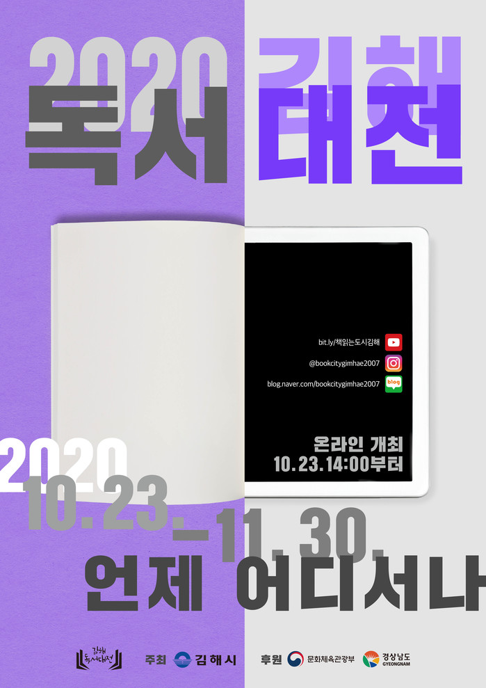 김해시는 오는 23일부터 11월 30일까지 ‘Book City 김해’를 주제로 ‘2020 김해독서대전’을 온라인 개최한다고 밝혔다.