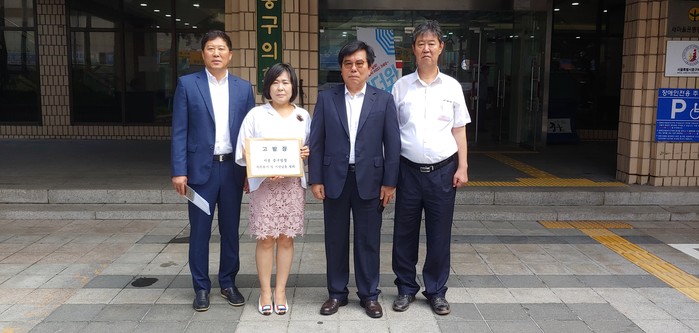 | ▲ 조영훈 의장 및 중구의원들이 중구의회 앞에서 고발장을 들고 있다. |