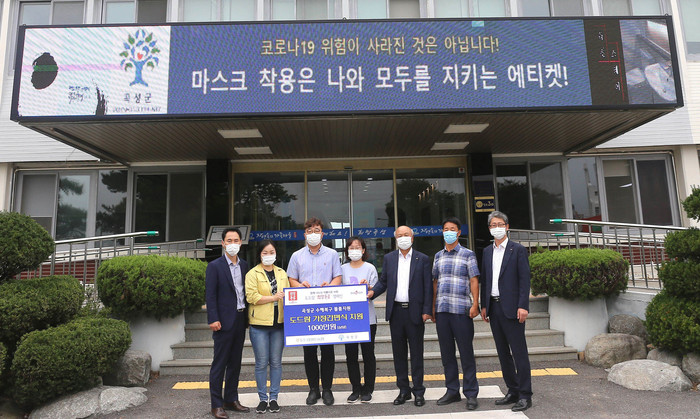 | ▲ 지난 21일 전남 곡성군청에서 진행된 곡성지역 수해민을 돕기위한 도드람 가정간편식 기부식에서 박광욱 도드람 조합장(오른쪽 세 번째)과 관계자들이 기념촬영을 하고 있다. (사진제공=도드람) |