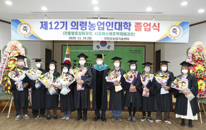 의령군(군수 권한대행 백삼종)은 지난 24일 농업기술센터 3층 농업교육장에서 의령농업의 변화와 혁신을 주도할 전문농업인력 양성을 위해 추진한 2020년도 제12기 의령농업인대학 졸업식을 가졌다고 밝혔다.