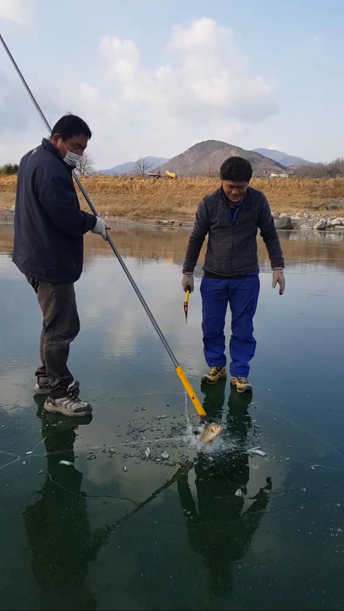 아침 최저 기온이 영하권 이하로 떨어지는 날이 계속되자 얼어붙은 경남 산청 경호강 인근 주민들이 작살로 누치를 잡아 올리고 있어 눈길을 끈다.