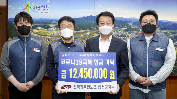 합천군(군수 문준희)은 전국공무원노동조합 합천군지부(지부장 김동석)에서 지난 31일 코로나 19로 어려움을 겪고 있는 군민들을 위해 코로나19 극복 성금 1,245만원을 기탁했다고 밝혔다.