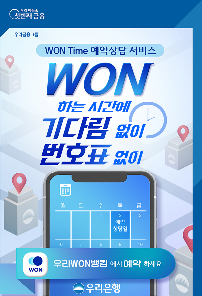 [시민일보 = 홍덕표 기자] 우리금융지주 자회사 우리은행은 비대면으로 고객이 원하는 영업점과 시간을 예약해 대기시간 없이 편리하게 상담받을 수 있는 ‘WON Time 예약상담서비스’를 5일부터 시행한다.
