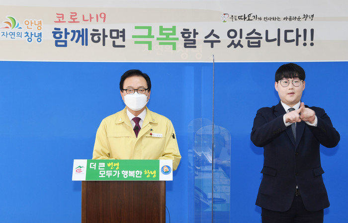 | ▲ 한정우 창녕군수(왼쪽)가 제2차 창녕군 긴급재난지원금 지급 계획을 발표하고 있다. |