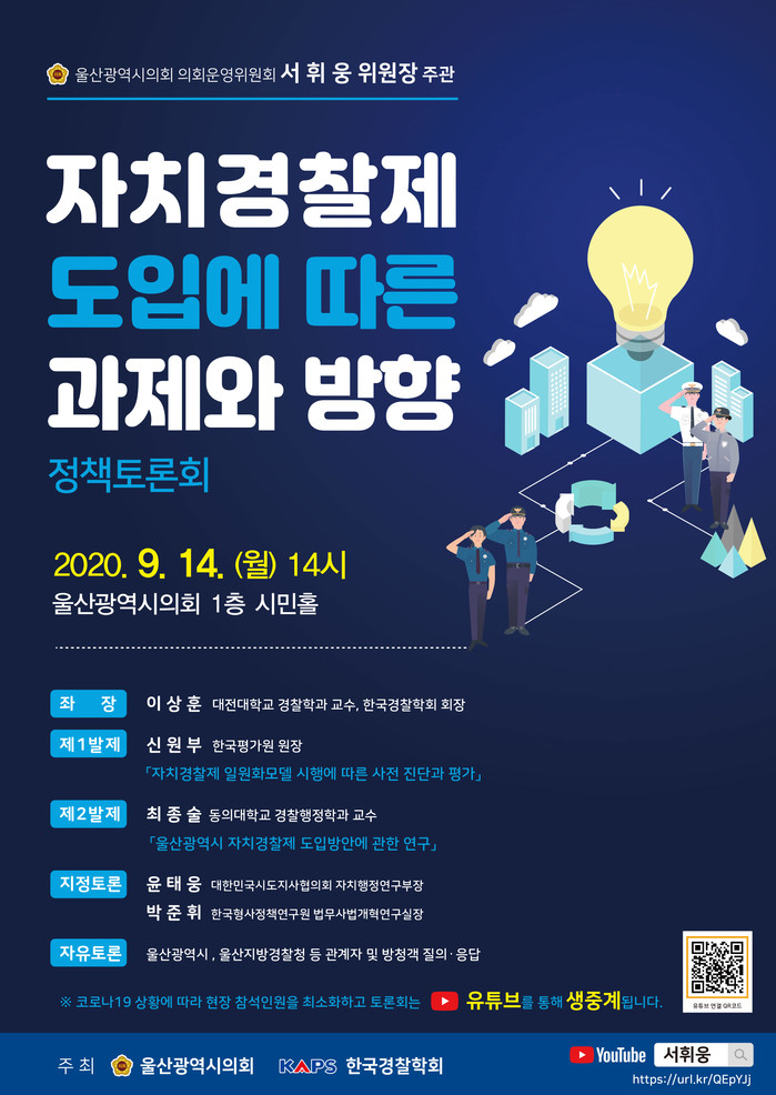 토론회는 ▲이상훈 한국경찰학회장(現 대전대학교 교수)의 개회사를 시작으로 ▲서휘웅 울산광역시의회 의회운영위원장의 환영사에 이어 ▲발제자들의 주제 발표와 지정토론 및 자유토론 순으로 진행된다.
