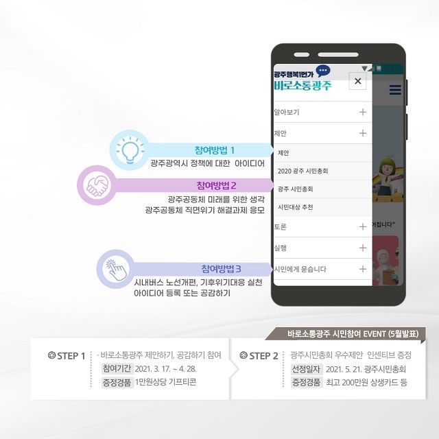 이 밖에도 광주시 정책에 대한 제안 또는 시내버스 노선개편, 기후위기 대응 생활 속 실천과제에 대한 아이디어를 내거나 공감한 시민을 대상으로 무작위 200명을 추첨해 기프티콘을 증정할 예정이다. 당첨자는 5월 중 바로소통광주 게시판을 통해 확인할 수 있다.