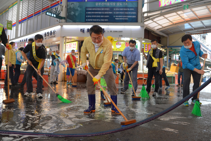 | ▲ 중부시장을 찾은 서 구청장이 구청 직원 및 시장 상인들과 중앙통로 바닥을 청소하고 있다. (사진제공=중구청) |