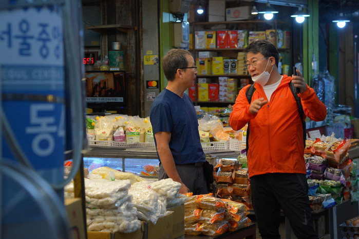 | ▲ 서양호 중구청장이 출근길에 황학동 중앙시장을 들려 상인과 이야기를 나누고 있다.(사진제공=중구청) |