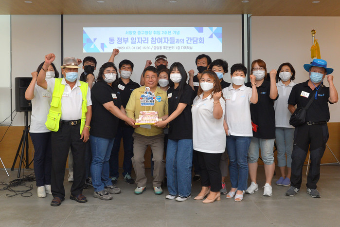 | ▲ 서 구청장이 동정부 일자리 참여자들과 기념촬영을 하고 있다.(사진제공=중구청) |