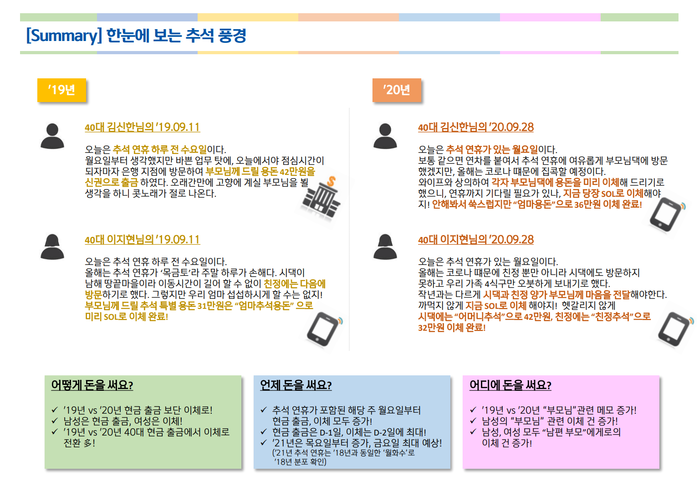 신한은행이 추석을 맞이해 준비한 ‘추석판 눈치코치 금융생활’은 2019년과 2020년 추석 연휴 전 1주일 동안의 유동성 계좌에서 발생한 현금 출금, 이체 데이터를 기반으로 돈이 ▲어떻게 ▲얼마나 ▲언제 ▲어디에 쓰였는지 살펴 보았다.