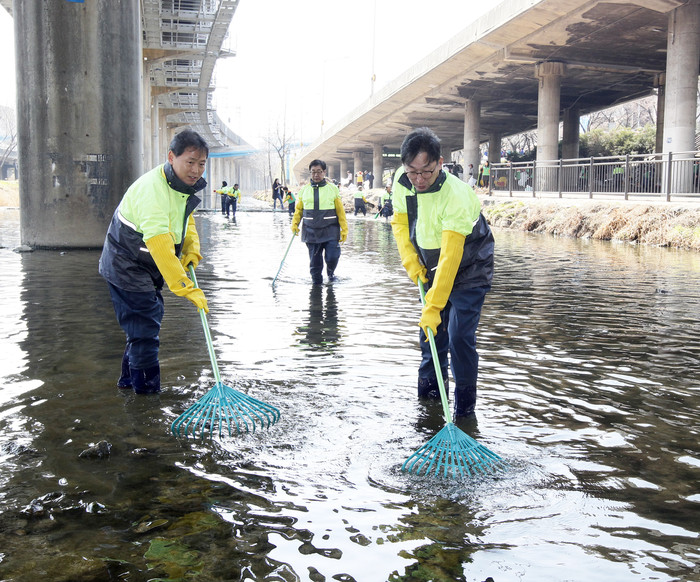 | ▲ 지난해 이창우 구청장(오른쪽)이 신대방1동 도림천 일대 청소를 하고 있다. (사진제공=동작구청) |