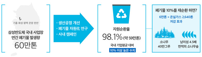 삼성전자 반도체 사업장의 자원순환율은 국내 평균 대비 10% 이상 높은 수준이다. 이 10%에 해당하는 폐기물 약 6만톤을 온실가스로 환산하면 연간 CO2 2,640톤 수준이며, 이는 소나무 40만 그루를 심어야 흡수할 수 있는 양이다.