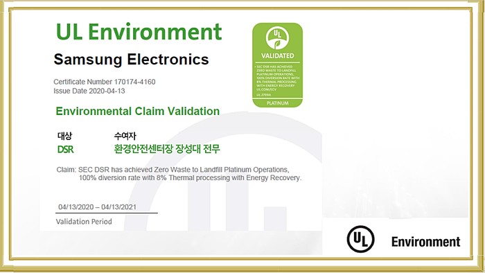 UL코리아 정현석 대표는 "삼성전자는 폐기물 처리 협력사와의 신뢰관계를 바탕으로 꾸준한 연구와 새로운 시도를 해나가고 있다"며 "이러한 협력의 성과로 전 사업장에서 높은 등급을 획득할 수 있었다"고 말했다.