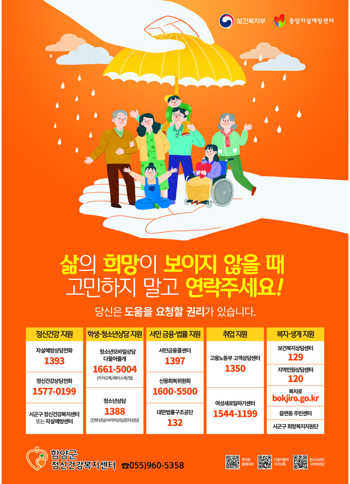 서춘수 함양군수는 “삶의 위기에 처한 주민들이 소중한 생명을 잃지 않도록, 자살예방 집중 홍보 기간을 통해 적극적으로 지원하겠다”고 말했다.
